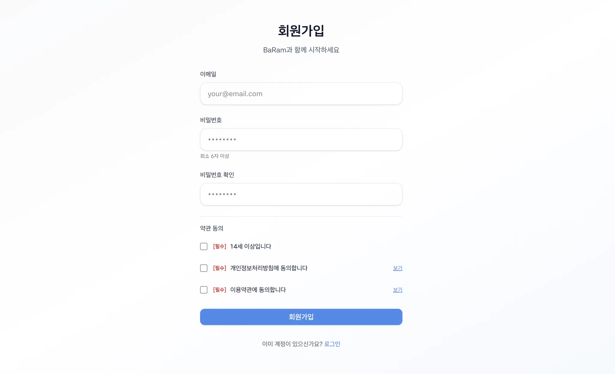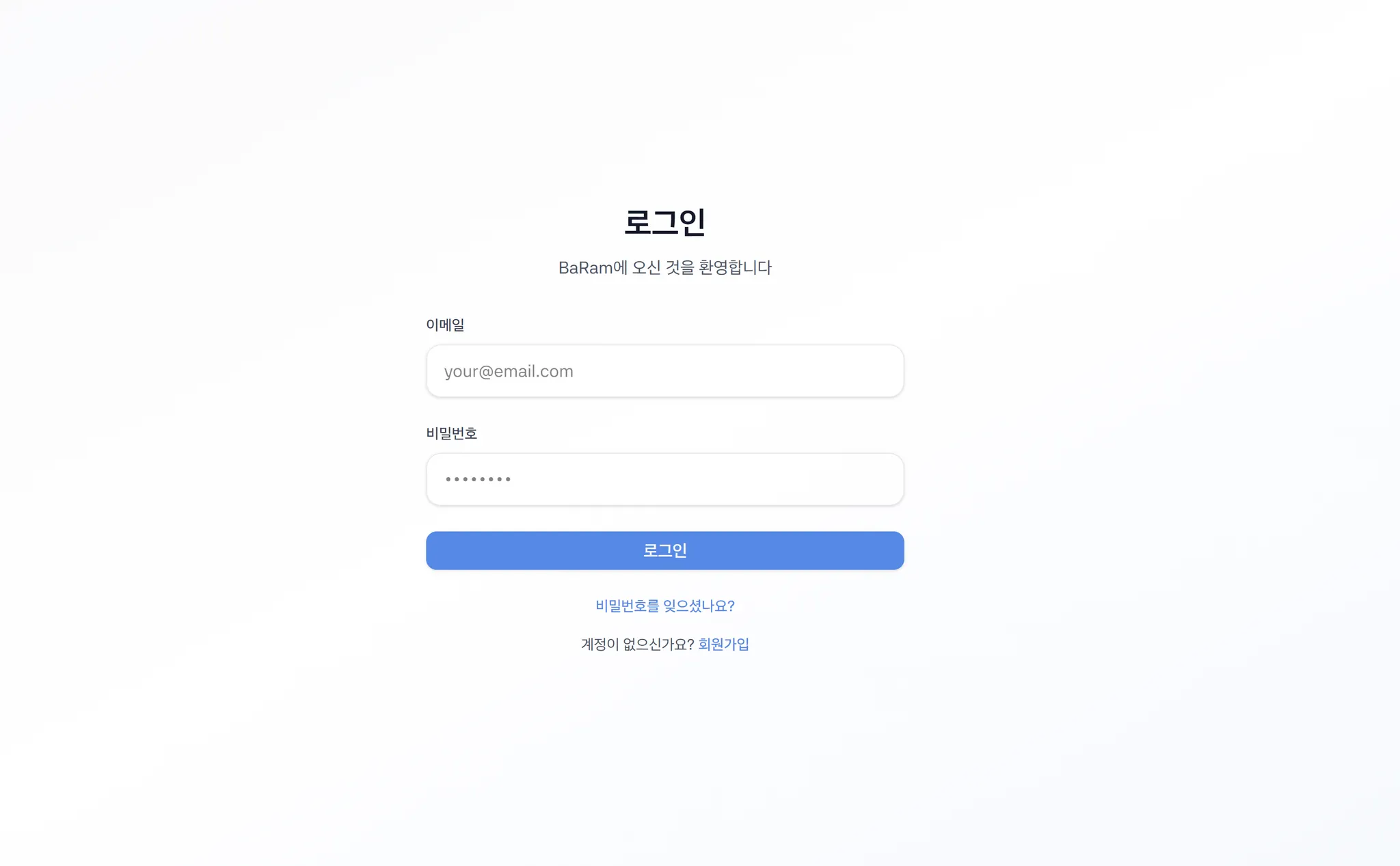 다시 홈페이지로 돌아와 로그인 페이지에서 회원가입한 정보를 입력하여 BaRam 서비스를 시작하세요.
