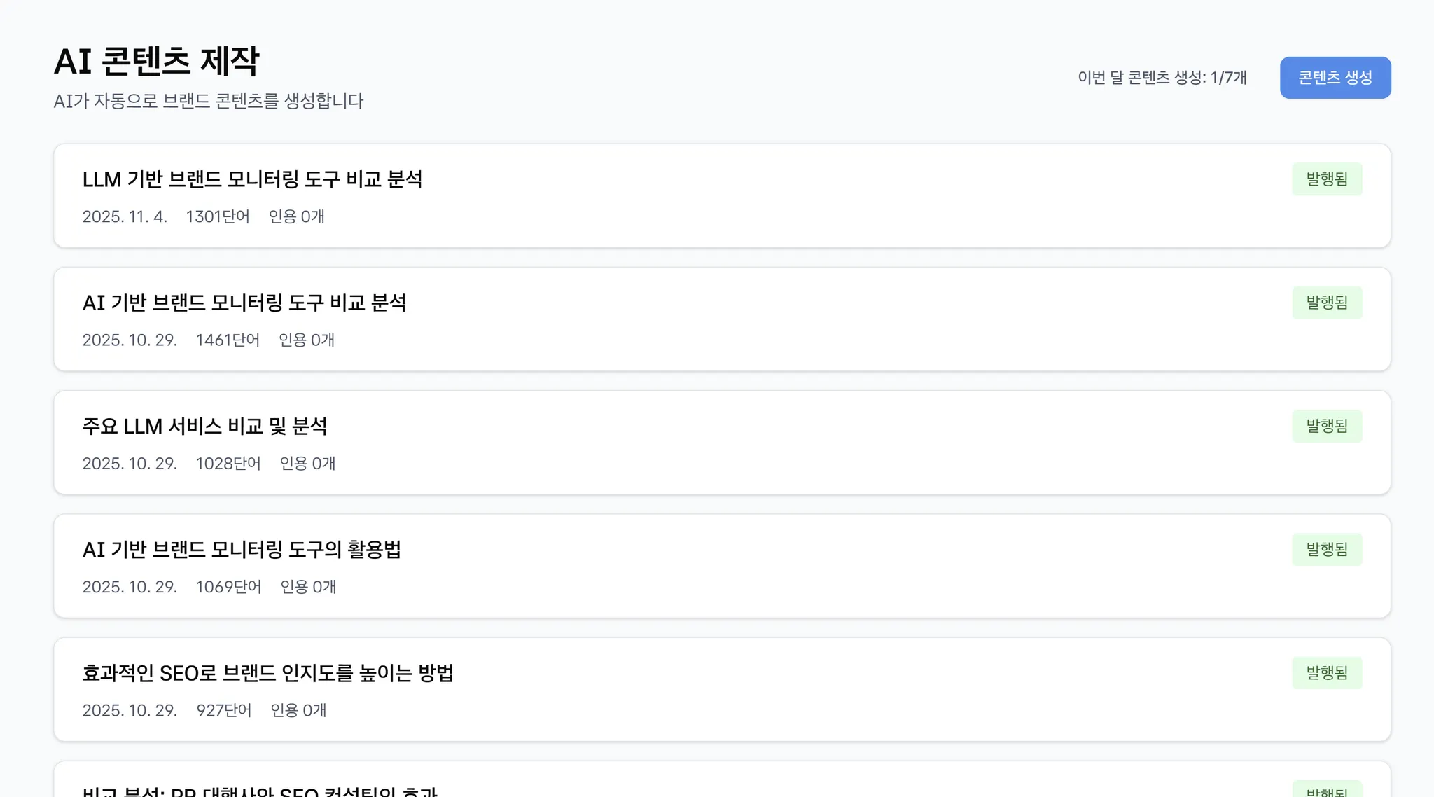 이 기능은 등록된 브랜드의 AI 응답 데이터를 기반으로 AI가 브랜드 콘텐츠를 새로 작성하는 자동화 기능입니다. “어떤 콘텐츠를 새로 써야 하는지, 어떤 문장이 더 효과적인지, 어떤 주제가 더 검색되는지”를 자동으로 판단하고 생산합니다.
